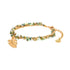 Chaquiras verdes terrosas combinadas con cadenas doradas y un dije de flor. Un look natural y sereno, ideal para reuniones al aire libre.