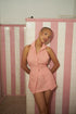 Set rosa de falda corta y top largo con escote en V y espalda descubierta. Su color es rosa pastel (Pantone 705 C).