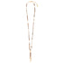 Con tonos cobrizos cálidos y cuentas de vidrio brillantes, este collar combina el encanto artesanal con acentos contemporáneos en baño de oro. Una pieza llamativa para looks elegantes y terrosos.