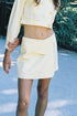 Falda corta tiro medio-alto con solapa delantera y cierre lateral. Color amarillo pastel. Diseñada y confeccionada en Colombia. Si prefieres que tu falda horme tiro medio-bajo, te recomendamos pedir una talla más a la que usas normalmente. Disponible bajo pedido.