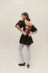 Vestido corto con mangas abombadas, abertura en la espalda y lazos para amarrar. Diseñado y confeccionado en Colombia.