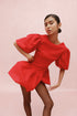 Vestido corto con mangas abombadas, abertura en la espalda y lazos para amarrar. Diseñado y confeccionado en Colombia. Disponible bajo pedido.