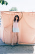 Vestido corto con corte en la cadera y abertura en la espalda con cintas para amarrar de color rosa y celeste. Diseñado y confeccionado en Colombia.